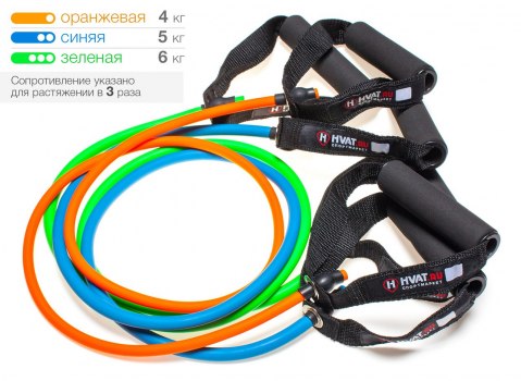 В наборе три трубки с ручками: оранжевая - 4 кг; синяя - 5 кг; зеленая - 6 кг. Сопротивление указано для растяжении в 3 раза.